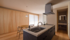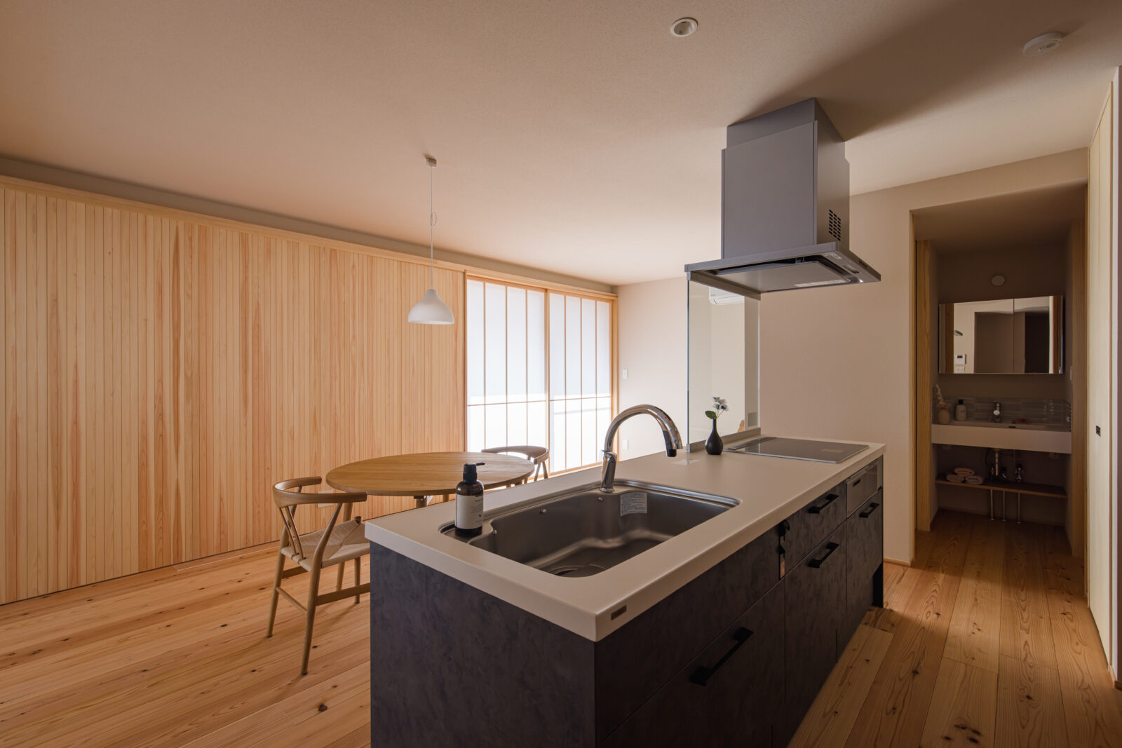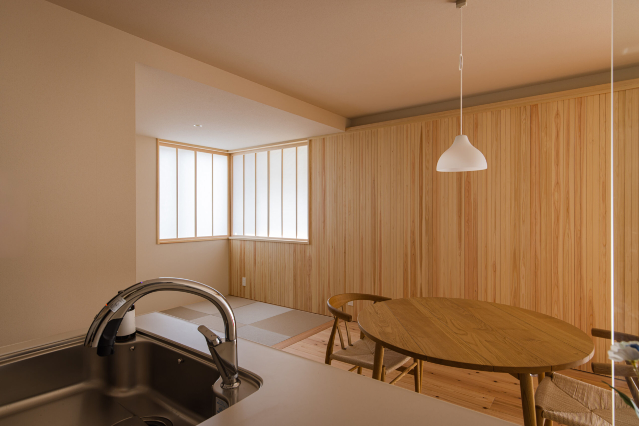 光がやわらかく差し込むLDK空間。 南側からの自然光を障子越しに取り込み、時間帯によって表情が変わる、心地よい明るさを演出しています。 壁の一部にはヒノキ材をあしらい、空間にやさしい香りとあたたかみをプラス。床には杉の無垢材を採用し、足触りの良さとともに、木のぬくもりを日常の中で感じられる仕上がりとしています。 キッチンにはアイランド型のLIXIL ノクトを採用。家族との会話を楽しみながら作業ができる、開放的で使い勝手の良いレイアウトです。背面には洗面スペースへとつながる動線を確保し、家事のしやすさにも配慮しています。