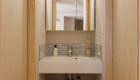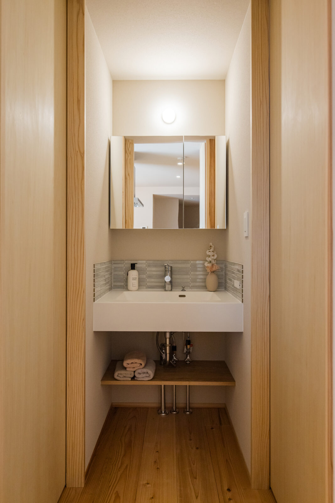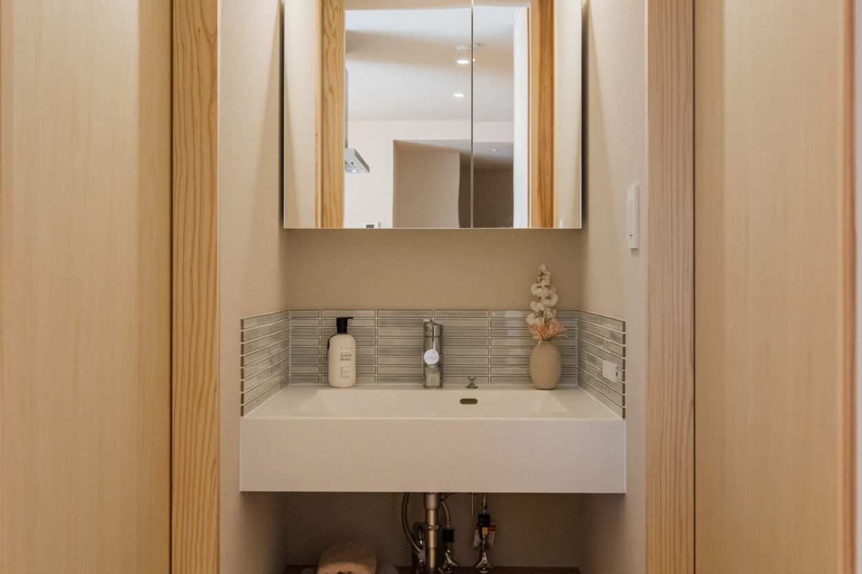 おしゃれな造作洗面台を採用。 空間に合わせて設計することで、シンプルながらも素材感が引き立つ、上質な洗面スペースに仕上げています。 洗面下にはオープンの収納スペースを設け、タオルや日用品をすっきりと収納できる実用的なつくりに。見せる収納としても楽しめるデザインです。 また、壁の一部にはタイルをあしらい、水ハネにも配慮。機能性とデザイン性を両立した、日々の使いやすさを大切にした洗面空間となっています。