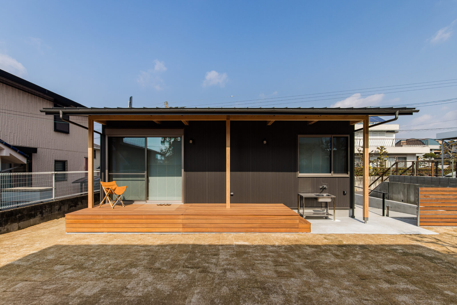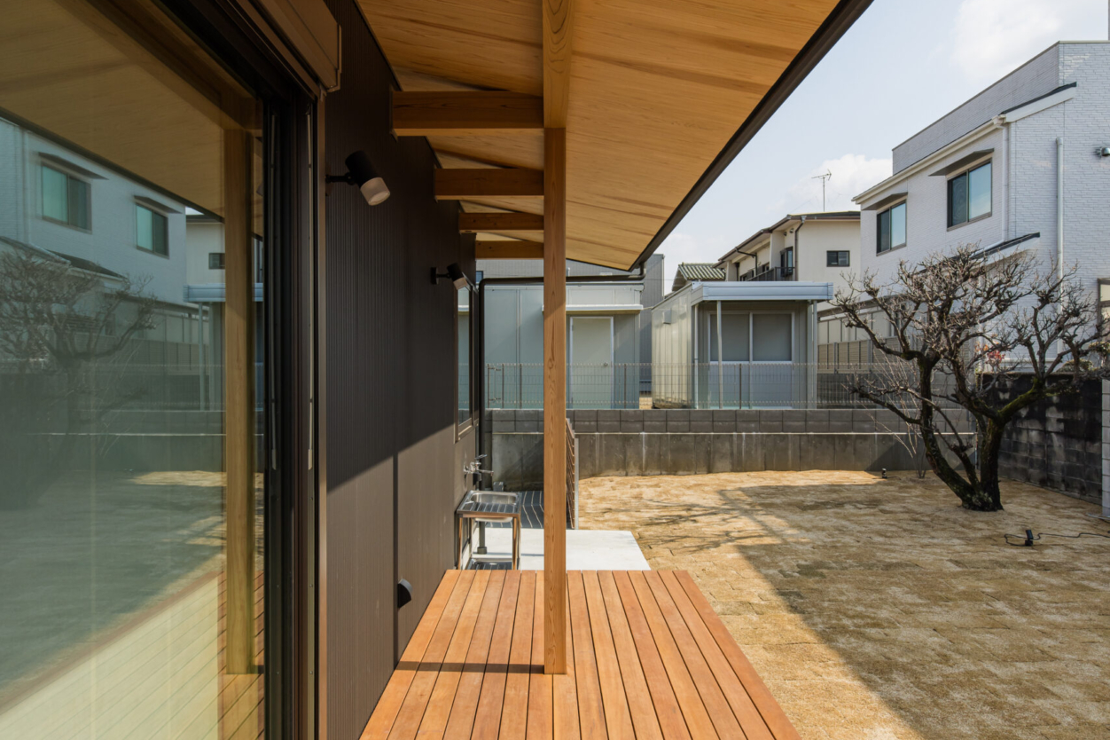 黒のガルバリウムに木のぬくもりが映える、モダンで美しい平屋住宅。広いウッドデッキはリビングとフラットにつながり、第二のリビングとして、またアウトドアを楽しむ場として活躍します。 ●外での調理や洗い物に便利なステンレス製屋外シンク ●視線を遮りつつ自然光を取り入れる機能的なデザイン ―― 自然と調和したのびのびとした暮らしを叶える住まいが完成しました。
