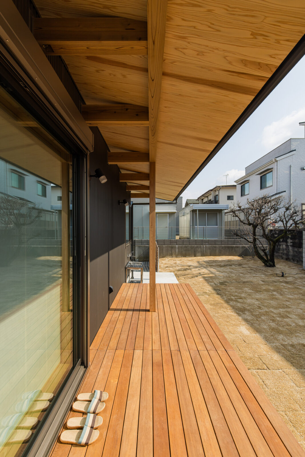 奥行き約2mのウッドデッキと、大きく張り出した庇が一体となった外部空間。 しっかりとした庇により、日差しをコントロールしながら、雨の日でも快適に使える半屋外の居場所をつくり出しています。 リビングとフラットにつながるデッキは、室内と外をゆるやかに連続させ、日常の中に自然を取り込む設計に。くつろぎの場としてはもちろん、家族の時間を広げる多目的なスペースとして活用できます。 また、家庭菜園や外作業の後に便利な外部用の洗面を設置。汚れを室内に持ち込まず、その場で洗える実用性にも配慮しています。 窓にはLIXIL TWを採用し、高い断熱性とデザイン性を両立。大開口によって、内と外が心地よくつながる住まいとなっています。