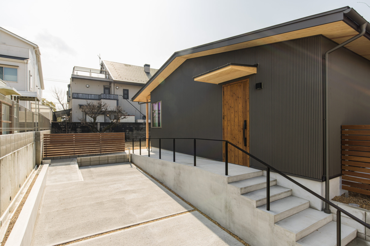 外壁には、ガルバリウム鋼板を採用しています。 耐久性とメンテナンス性に優れ、長く安心して住み続けられる外観としました。縦のラインが美しい外壁は、シンプルでありながらも陰影が生まれ、時間帯や光の加減によって表情が変化します。 また、軒天や玄関扉には木の素材を取り入れることで、無機質になりがちな外観にあたたかみをプラス。黒を基調とした外壁とのコントラストが、落ち着きのある佇まいを引き立てています。 アプローチは緩やかなスロープと階段を併設し、使いやすさと安全性に配慮。シンプルな外構とすることで、建物そのものの美しさが際立つ計画としています。