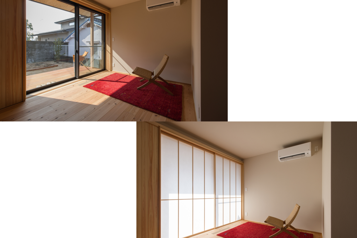 LDKには、来客時にも気兼ねなく使える和室スペースを設けています。 リビングとフラットにつながることで、空間全体に広がりを持たせ、日常的にも使いやすい設計としています。 障子越しにやわらかく光を取り込み、落ち着きのある和の雰囲気を演出。壁一面にあしらった木の素材と調和し、LDK全体を和を基調とした統一感のある空間にまとめています。 普段はくつろぎの場として、来客時には客間として。暮らしのシーンに応じて柔軟に使える、心地よい和のスペースです。