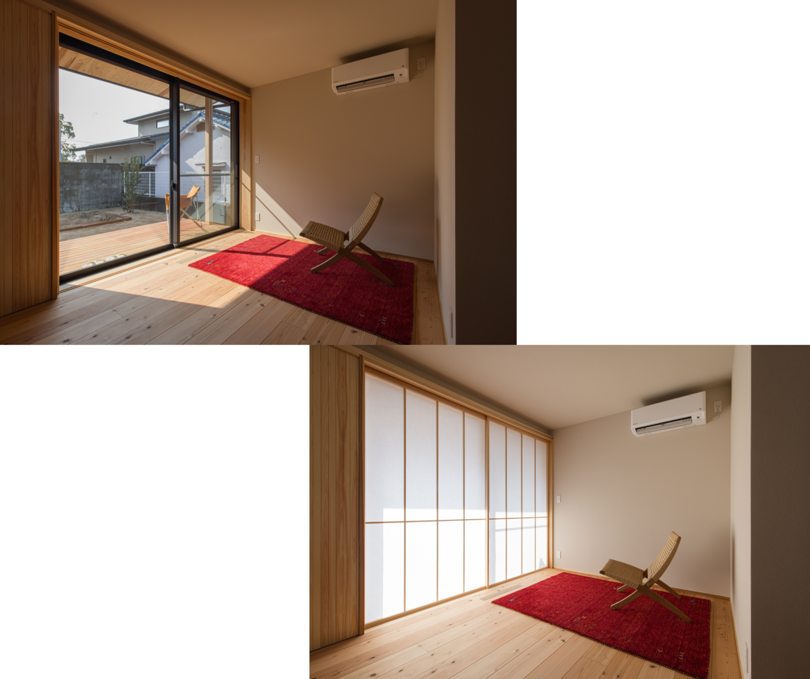 吉野杉の無垢フローリングが美しい、ぬくもりあふれる和モダンのLDK。南向きの大きな掃き出し窓からは自然光がたっぷり差し込み、室内とフラットにつながるウッドデッキが開放感を高めます。 ●障子を閉めれば、外からの視線を遮りながらやさしい光に包まれる落ち着いた空間へ ●高性能な断熱・気密仕様により、エアコン1台で季節を問わず家全体が快適 ―― 昼は明るく、夜は障子を通した柔らかな光を楽しみながら、自然素材と共に健やかに暮らせる住まいが完成しました。